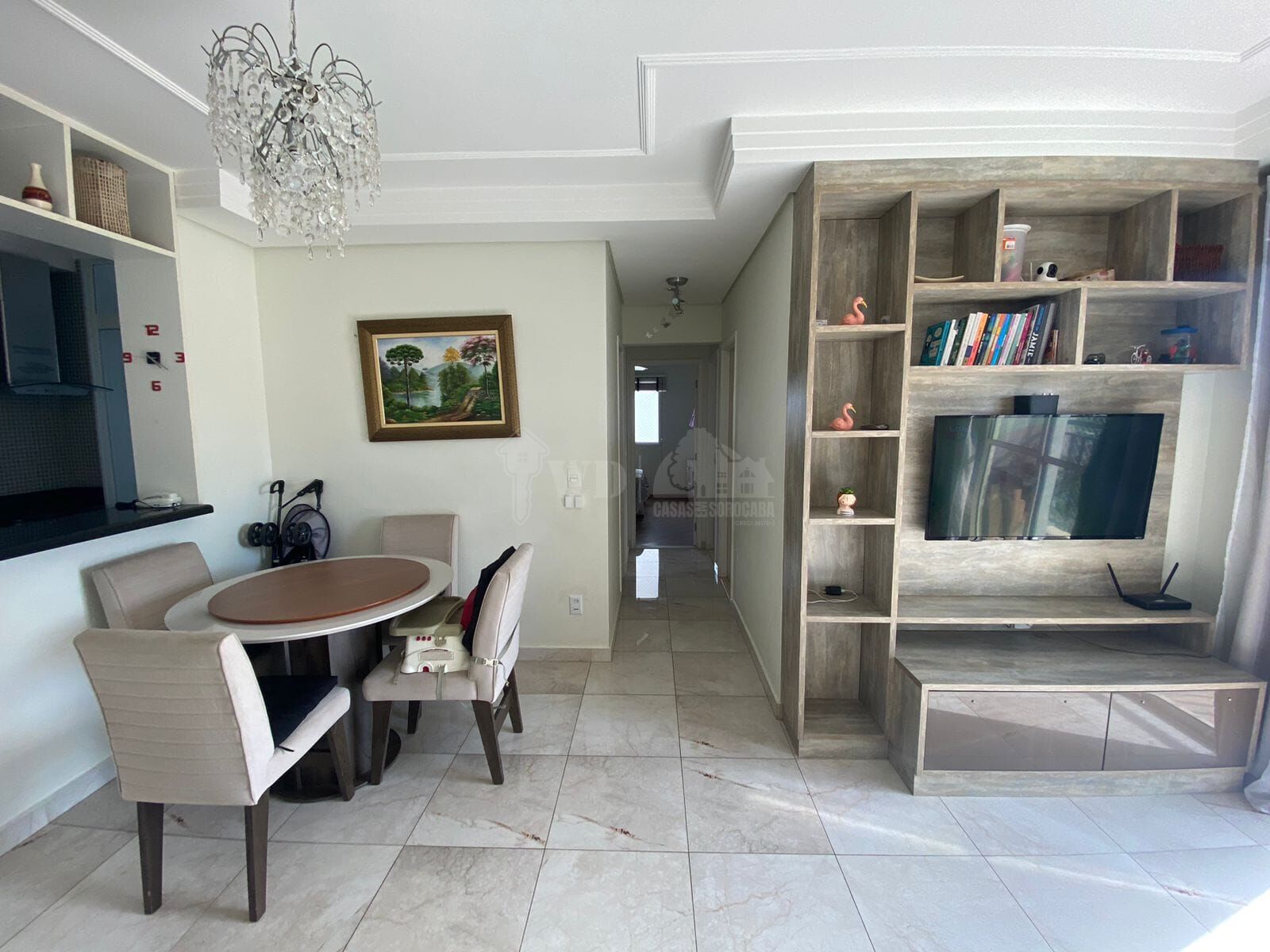 1 sala de Tv com painel integrada área para refeições .