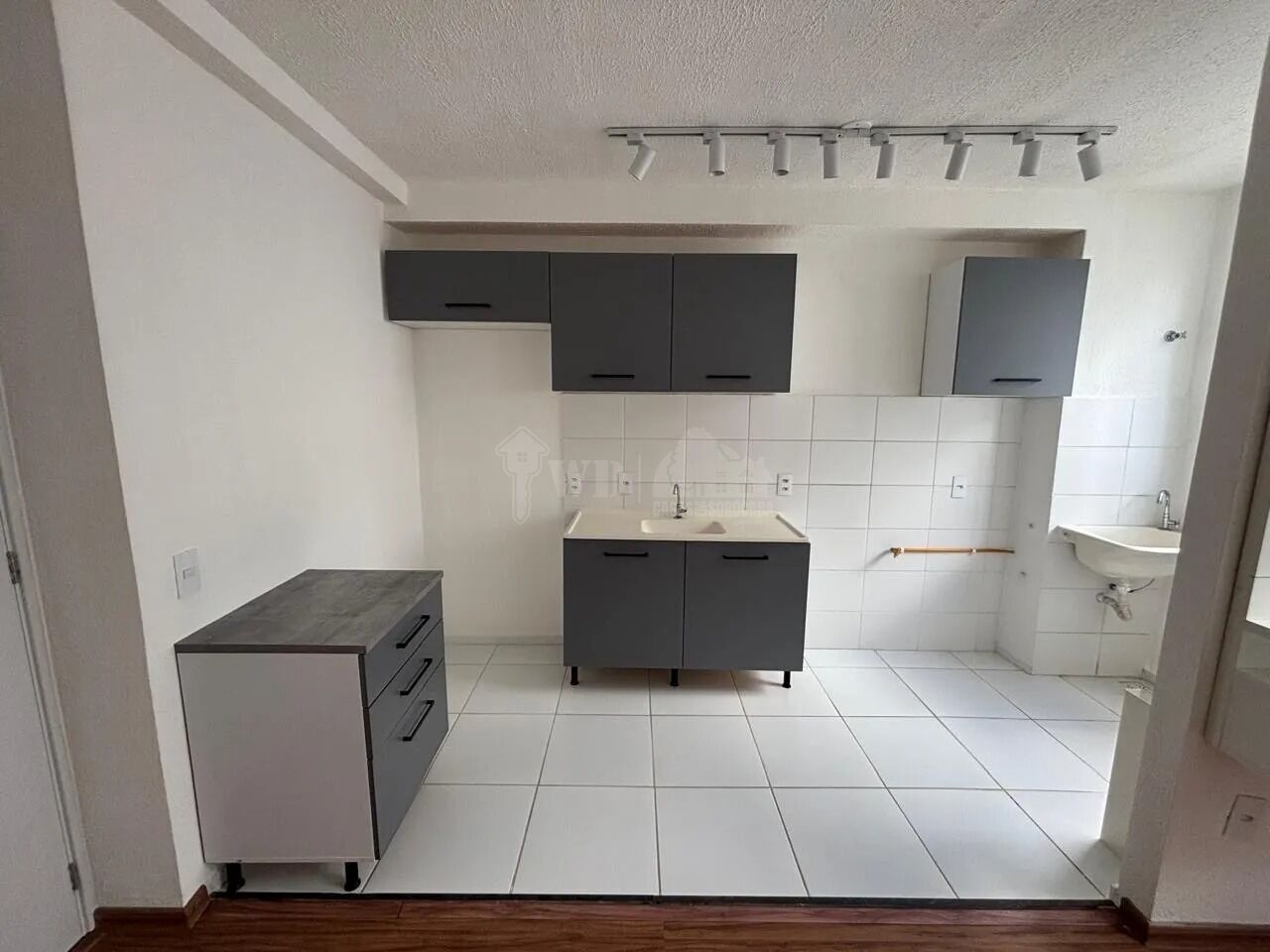 Apartamento com 2 quartos, com armários na cozinha, rack na sala e ventiladores nos quartos. Possui também área de serviço e churrasqueira.